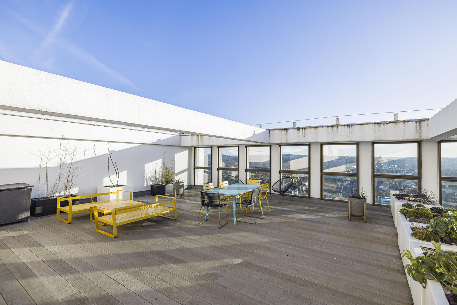 Upon arrival, you are welcomed into a light-filled sanctuary featuring an expansive open-plan kitchen and living area, enhanced by large, south-facing windows. Positioned high above the surrounding area, these windows not only flood the space with natural light but also frame stunning panoramic views, creating an impressive backdrop to everyday living. The south-facing aspect also contributes to excellent heat retention, keeping the flat warm and inviting, even during the winter months.