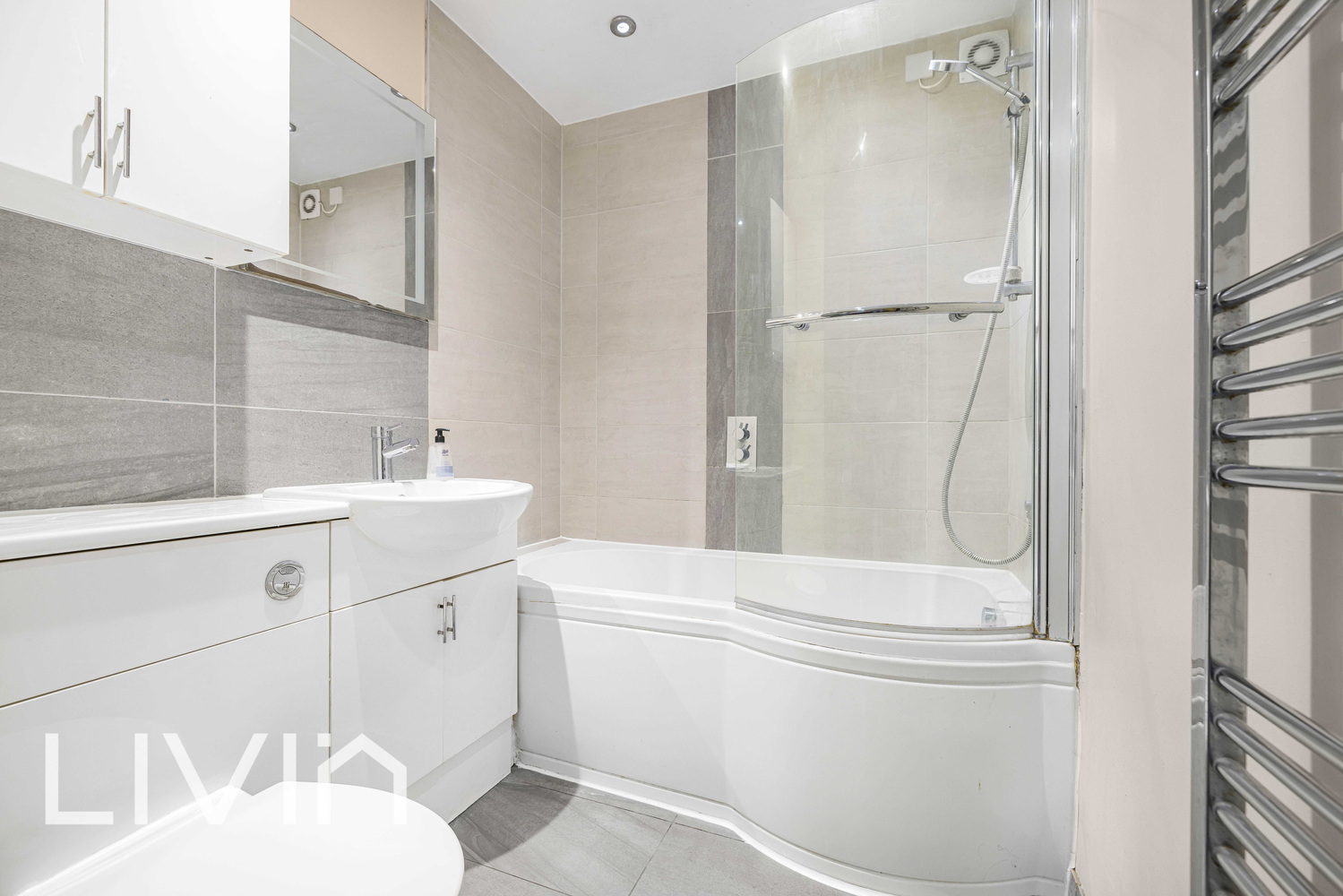 Both bedrooms are well-proportioned and the bathroom is finished in a modern style, complete with a full-sized bath and overhead shower.