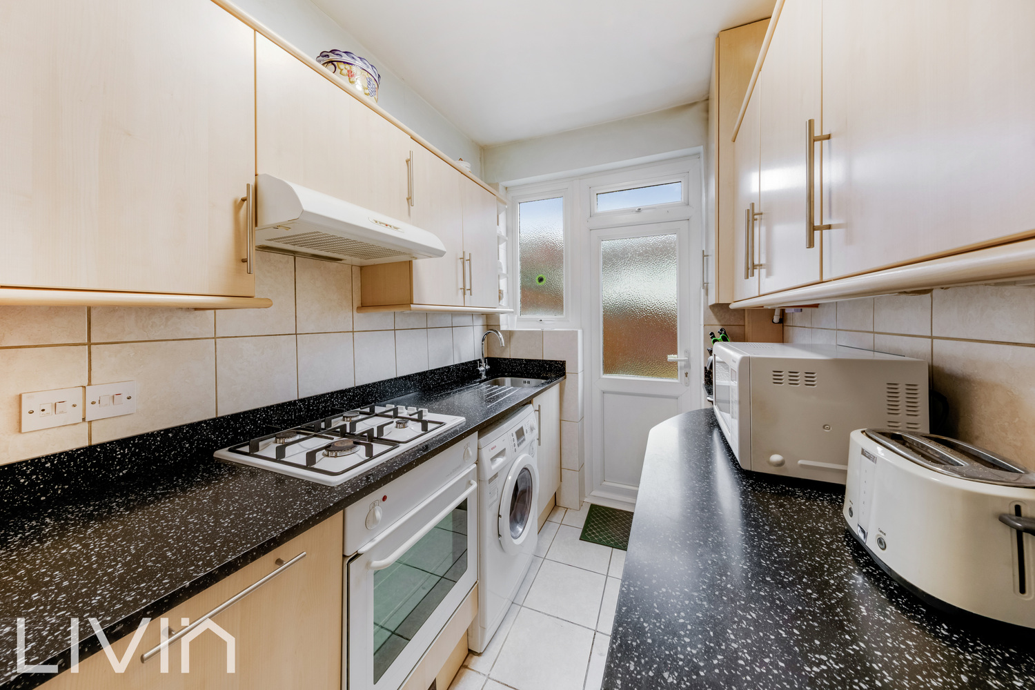 To the rear, the fitted kitchen is arranged in a smart galley style with ample cupboard storage and worktop space, tiled splashbacks and integrated cooking appliances. A rear door provides direct access outside, making it ideal for everyday convenience and summer hosting.