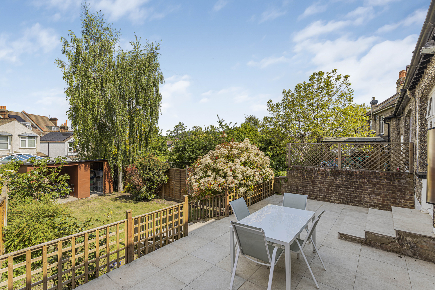 The rear garden is split into two sections, offering ample space for outdoor leisure and gardening, while a substantial shed at the far end adds valuable storage.